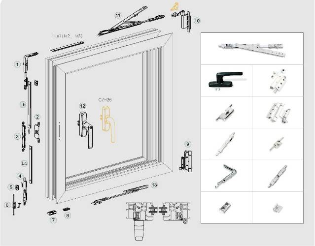各种系列的五金配件为建筑师设计布置窗户提供了极大的方便,通过执手的联动操作使窗扇有内平开、下悬和关闭功能,由于巧妙设计的支承结构,达到安全操作的目的。